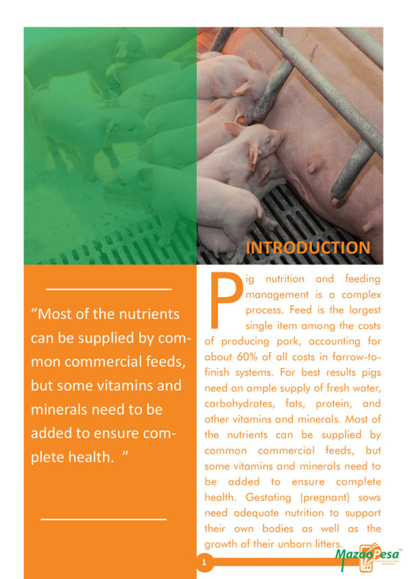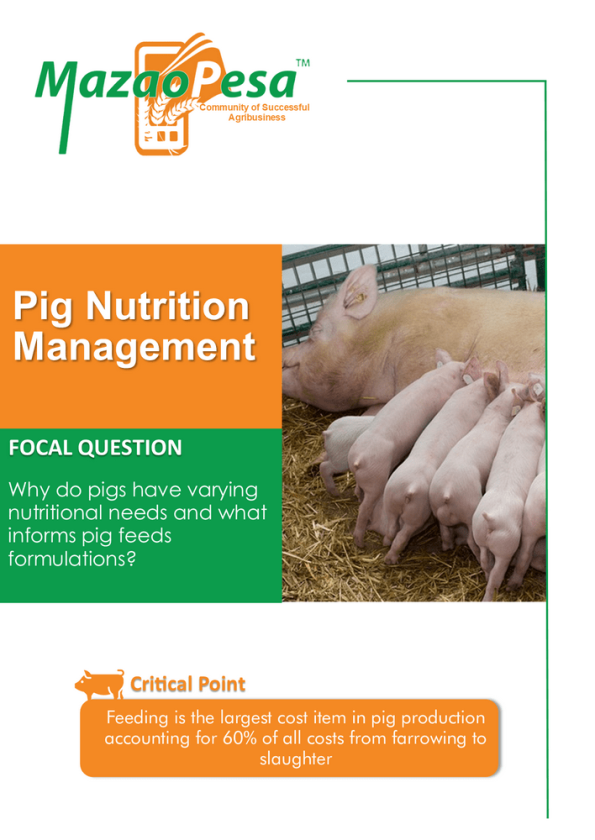 Pig nutrition and feeding management is a complex science and process; this topic highlights the Key components of a pig diet, feeding requirements at different growth and development stages as well as efficient feeding methods.